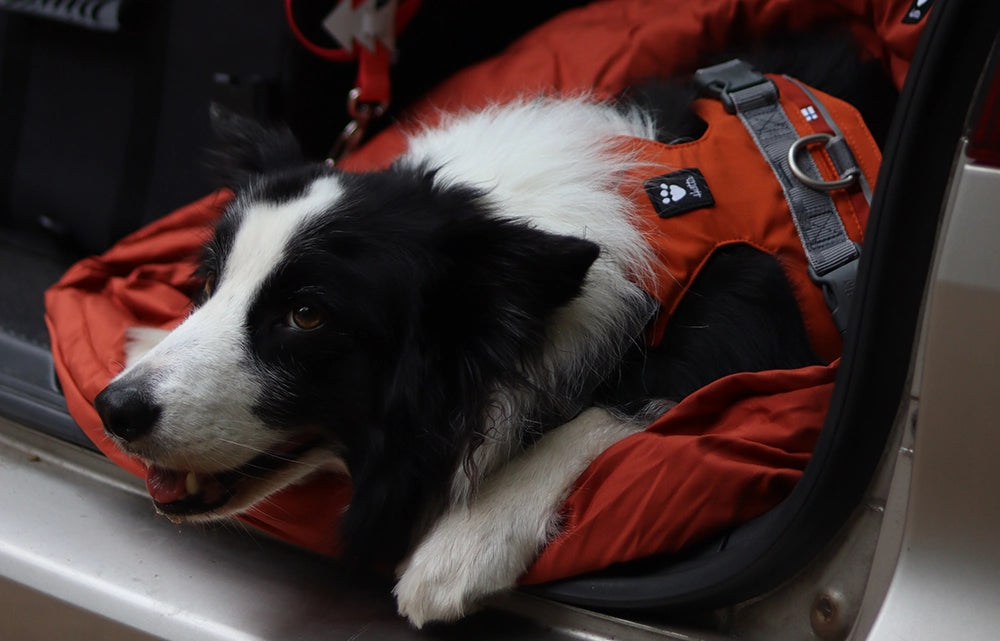 Hurtta Adventurer, Border Collie, Optimus weigh about 19kg. Optimus wears the new Hurtta Rover Harness in size 65–80 in color Cinnamon.