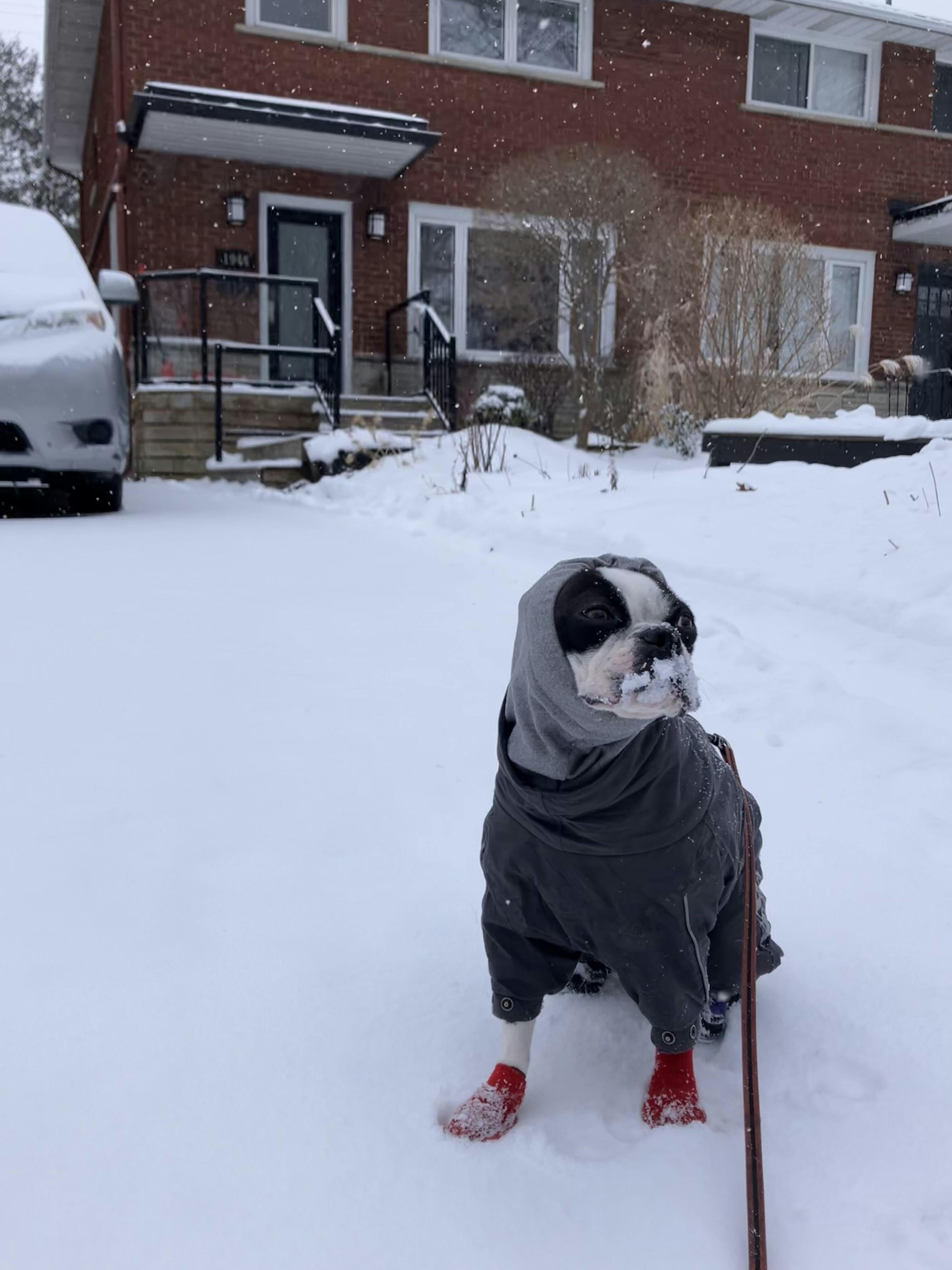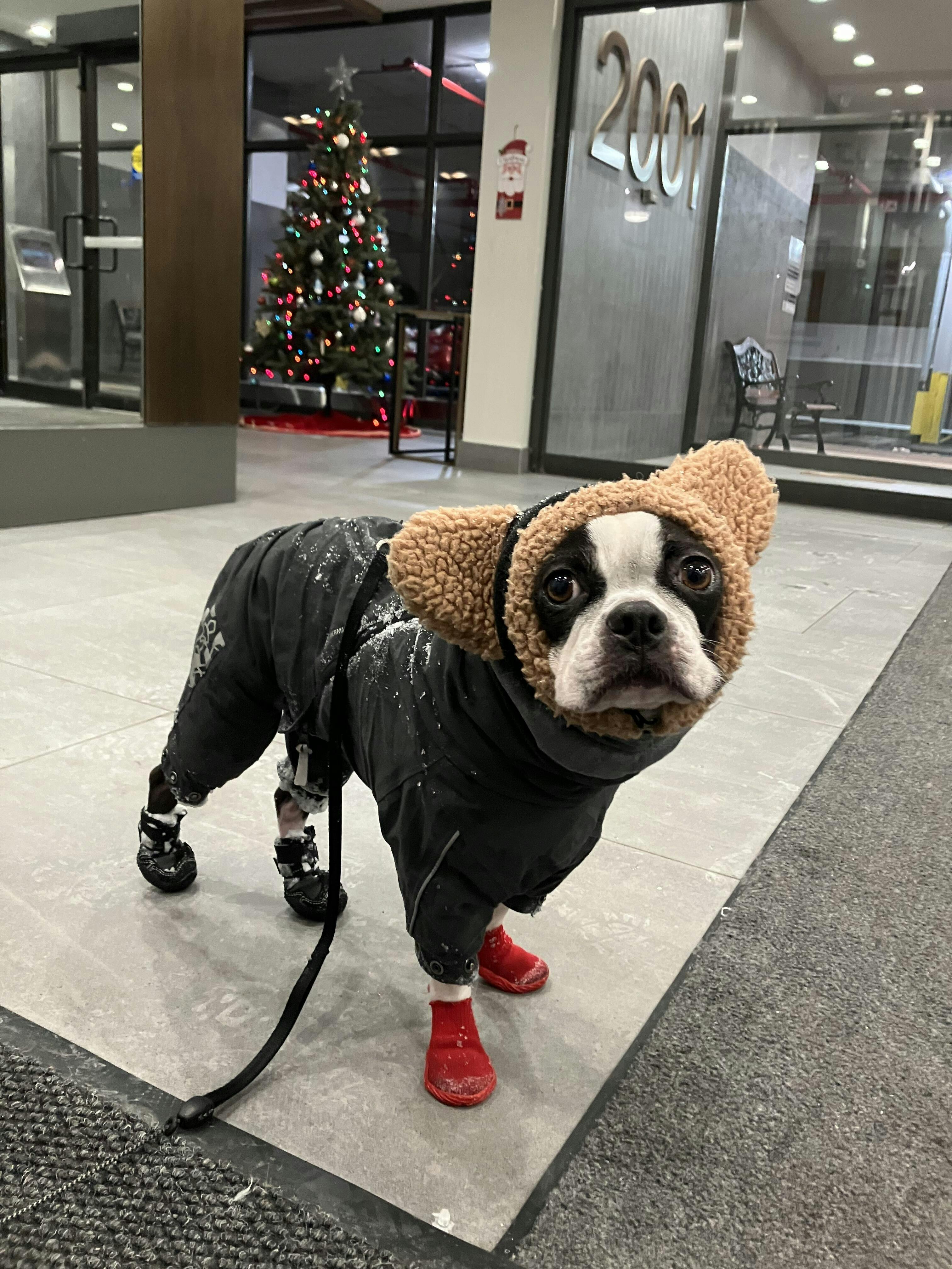 Haalarissa tärkein mitta on koiran selänpituus. Jos koirasi mitat jäävät kokojen väliin, kannattaa sinun valita pienempi koko.