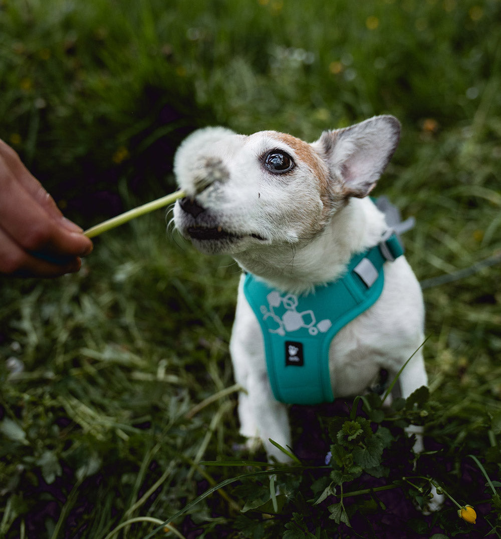 Nano is 7,5kg Jack Russell Terrier senior dog and wears color Peacock and size 45-60 in Hurtta Weekend Warrior dog Harness II Eco.
