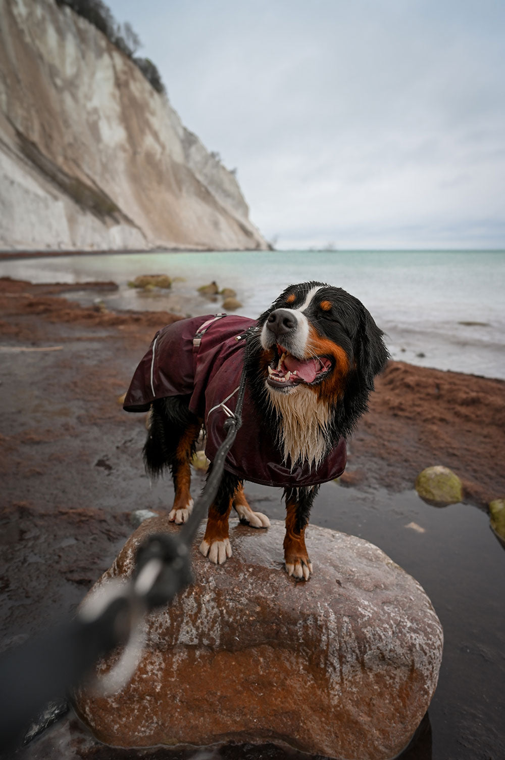 Marie and Rosie are Bernese Mountain Dogs and wear size 65 in our Hurtta Mudventure Coat Eco dog rain jacket in colors Eggplant and Cinnamon.