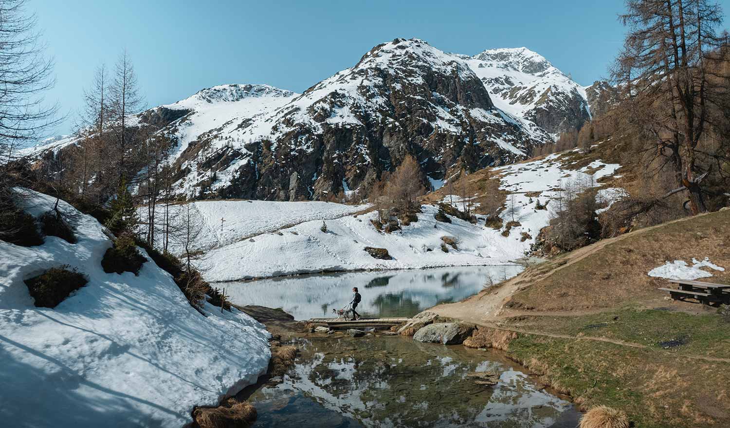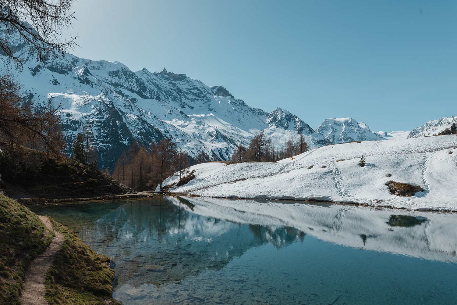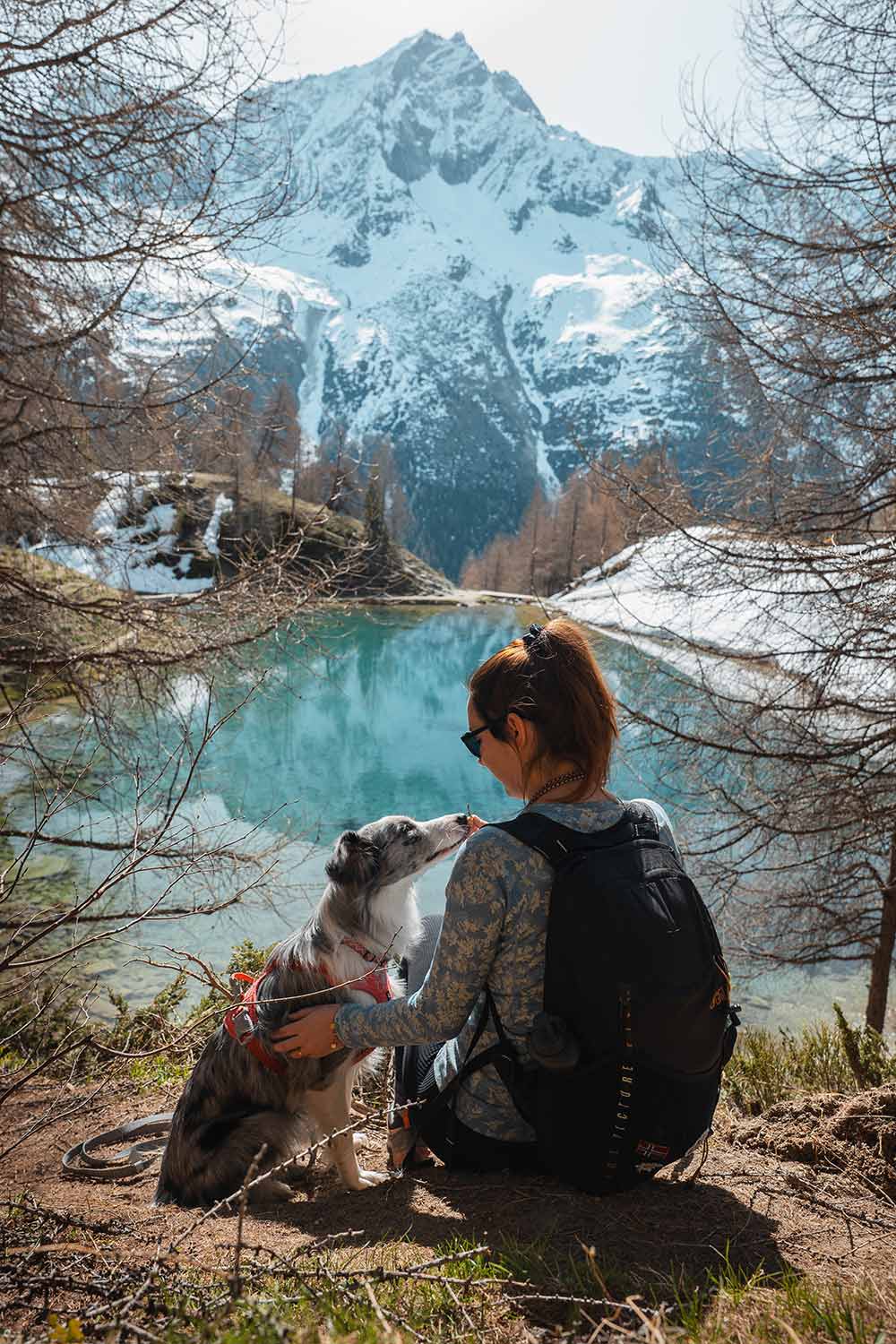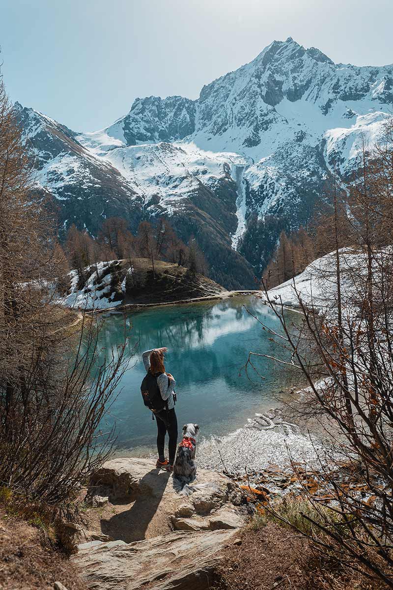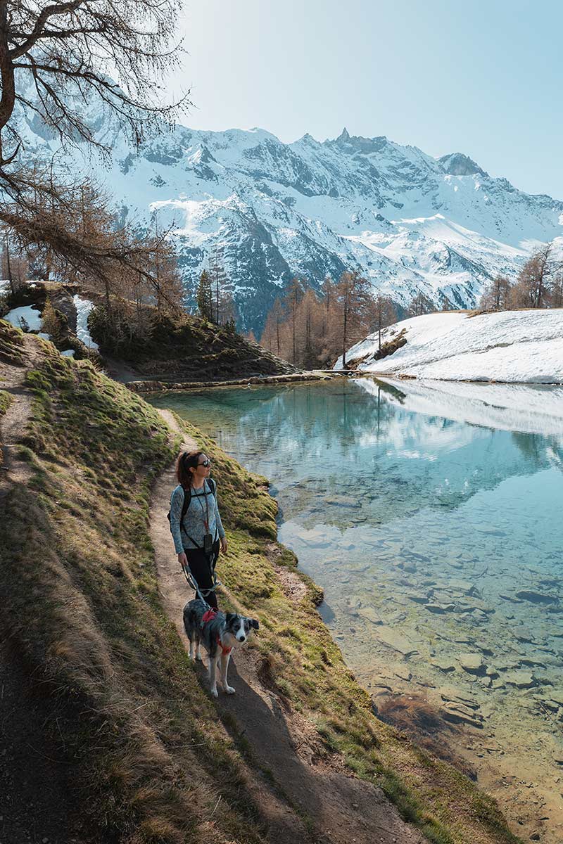 L’arrivée au lac est magique. Les eaux d’un bleu profond, bordées de neige, nous coupent le souffle. On immortalise le moment. Houna pose fièrement. Uffie, fidèle à elle-même, préfère bouger, courir, sentir.