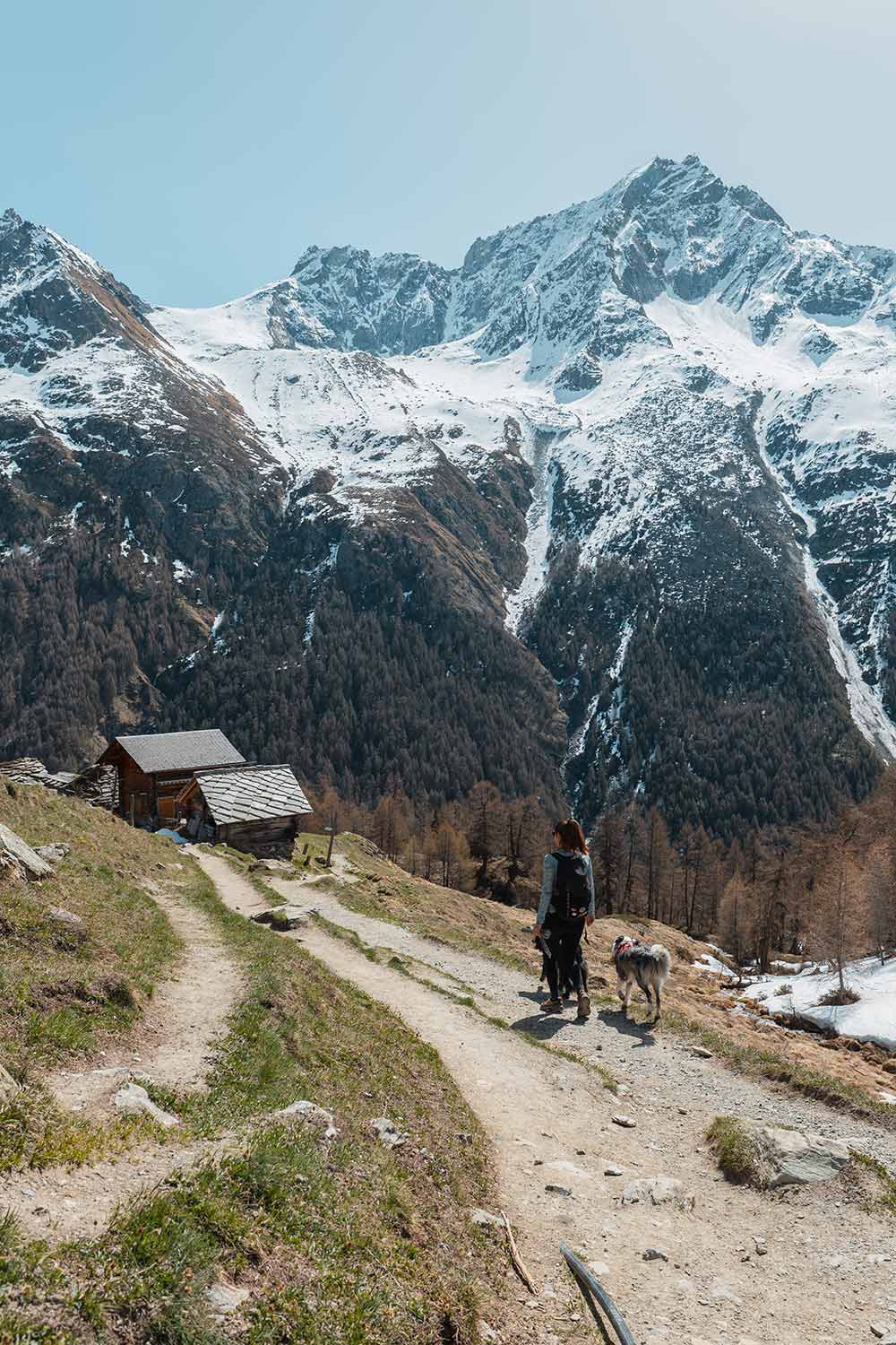 No sleeping in today—we’re heading out for a hike to Blue Lake of Arolla. As soon as we start putting on our hiking shoes, they know. They wiggle, whine, and the moment we clip on their harnesses, it’s pure excitement in our tiny 6m² space.