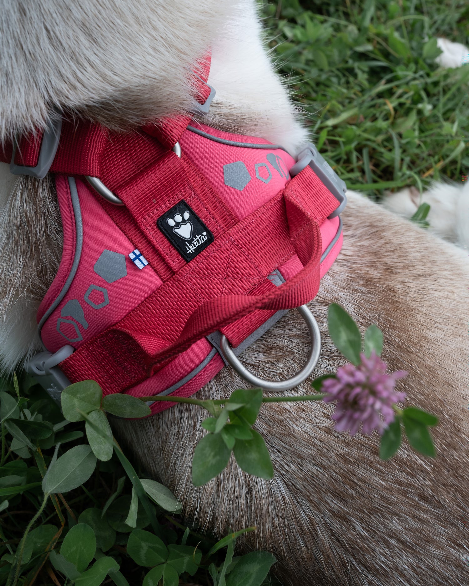 Beyond fashion, thanks to reflective prints onthis dog harness, Noora and Lugz stay visible and secure during our adventures.