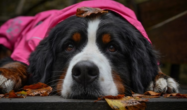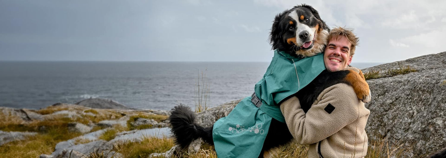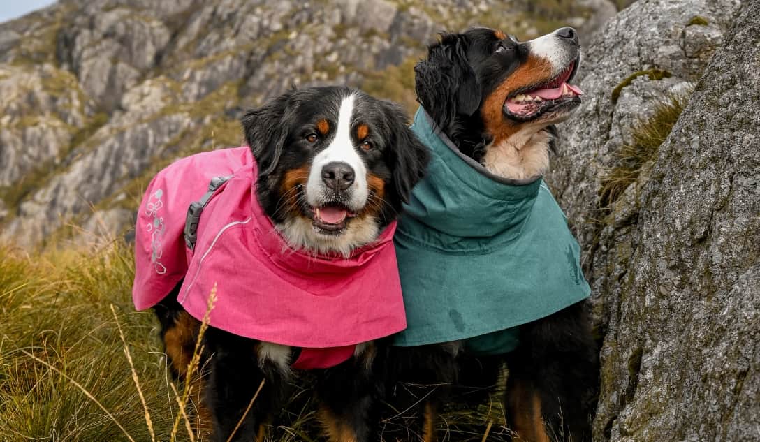 These two Bernese Mountain Dogs Lucy & Marie are wearing the size 70 from Hurtta Monsoon doc rain Coat in colors Peacock and Ruby.