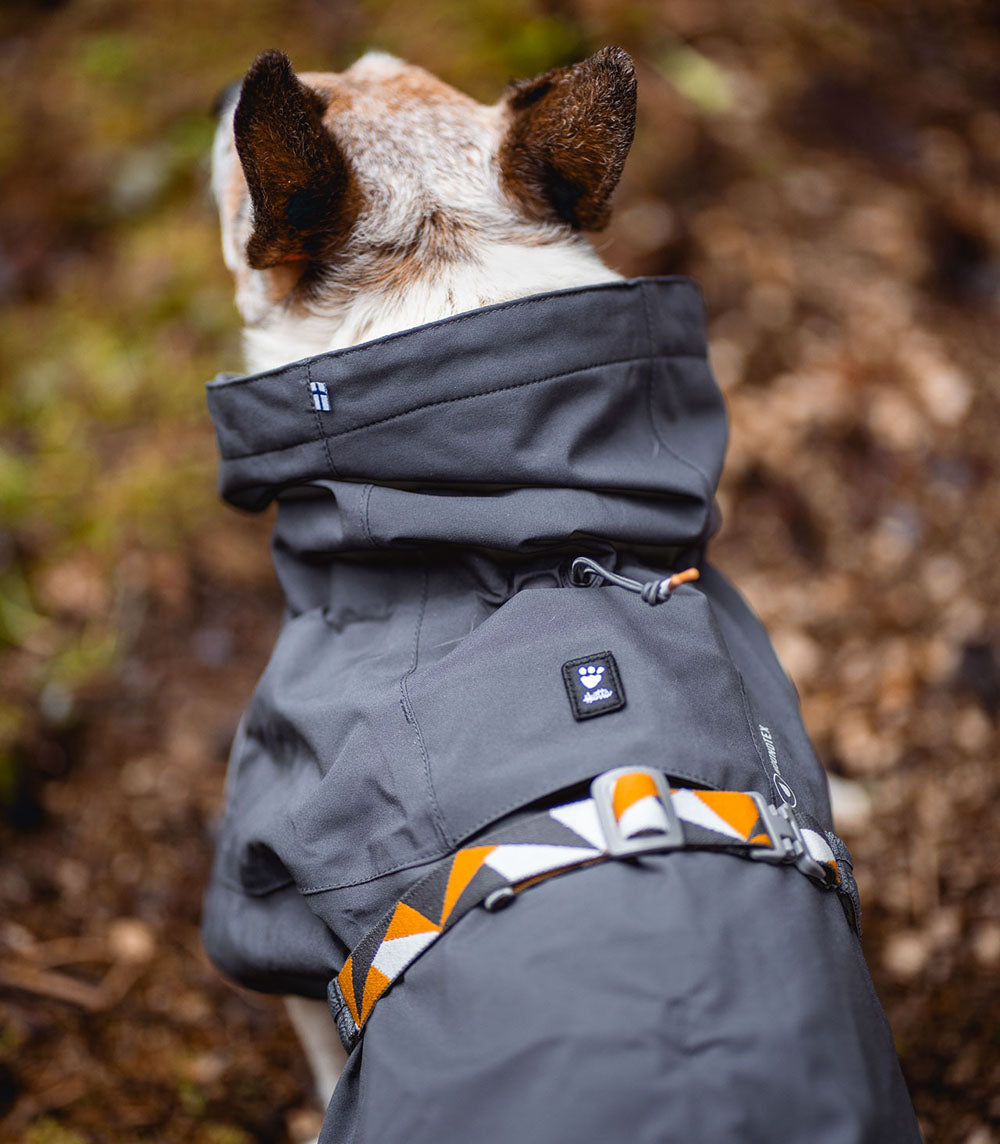 Nano is 7,5kg Jack Russell Terrier senior dog and wears size 30 in Hurtta Mudventure coat eco dog rain jacket.