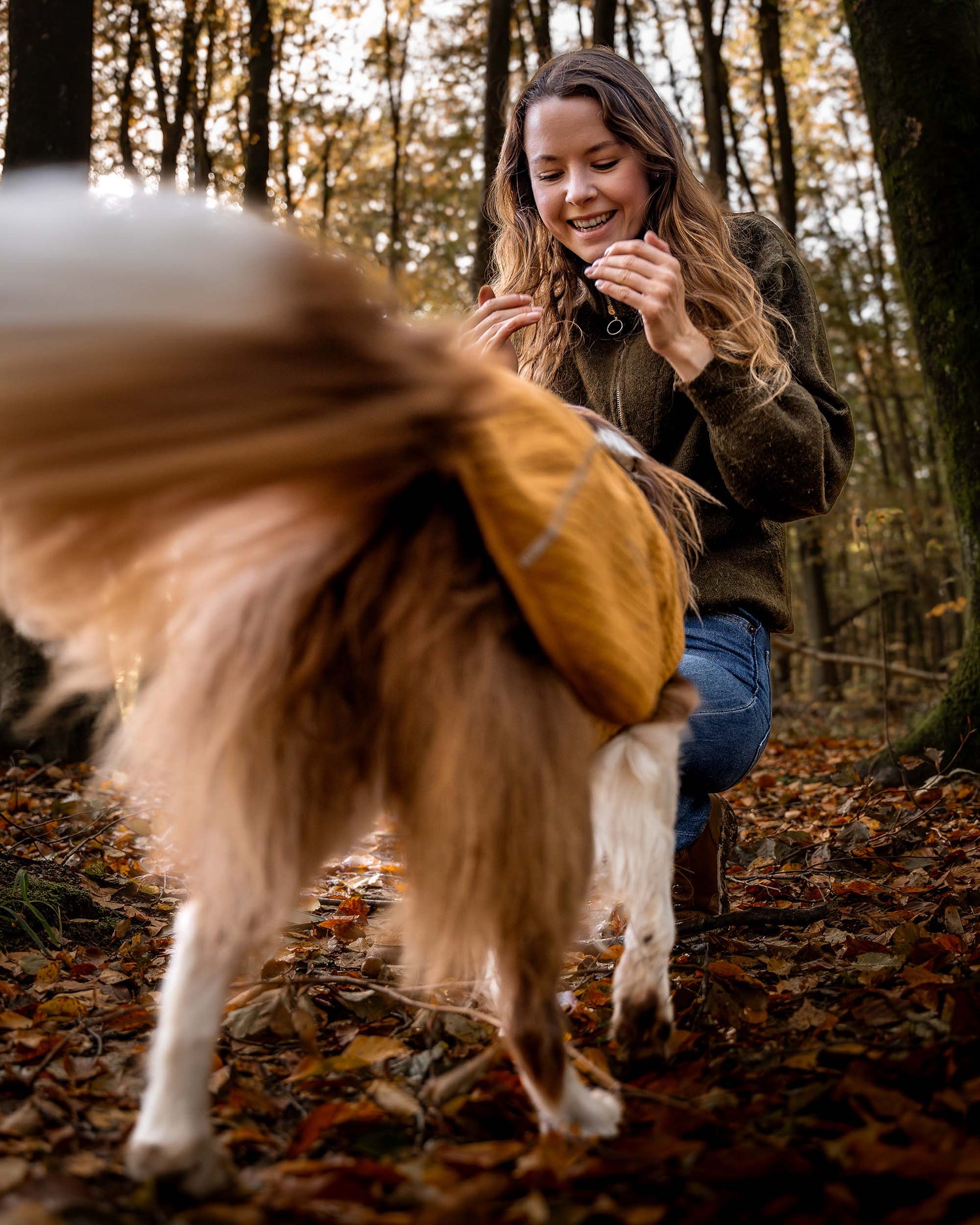 I love the changing colors, cozying up with tea, blankets (lots of blanket) and a warm fluffy Keela and pulling on a nice sweater! There's something about being bundled up in comfy clothes when you go for a walk in crisp fall air, when the leaves fall and crunch under feet and paws and when you can enjoy hours outside without being too hot or cold! Keela definitely also turns up the speed, loves rolling in the leaves and getting the occasional muddy paws (okay, okay, it's very often very muddy in Denmark 😅).
