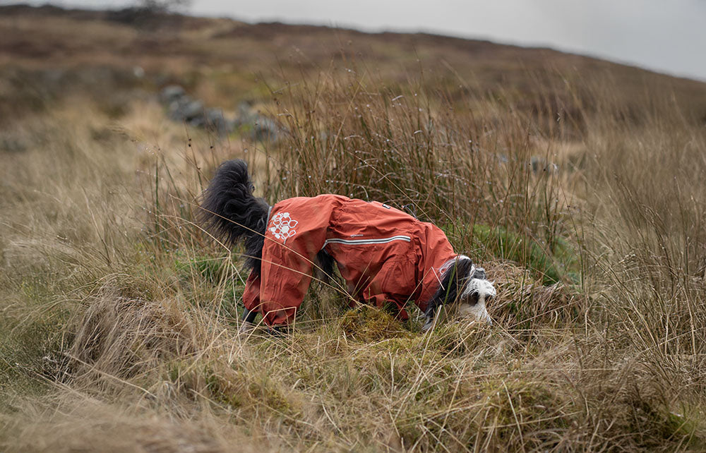 Hurtta adventurer Tessa is a small 14.8 kg border collie who wears a size 50M in the Mudventure Overall.