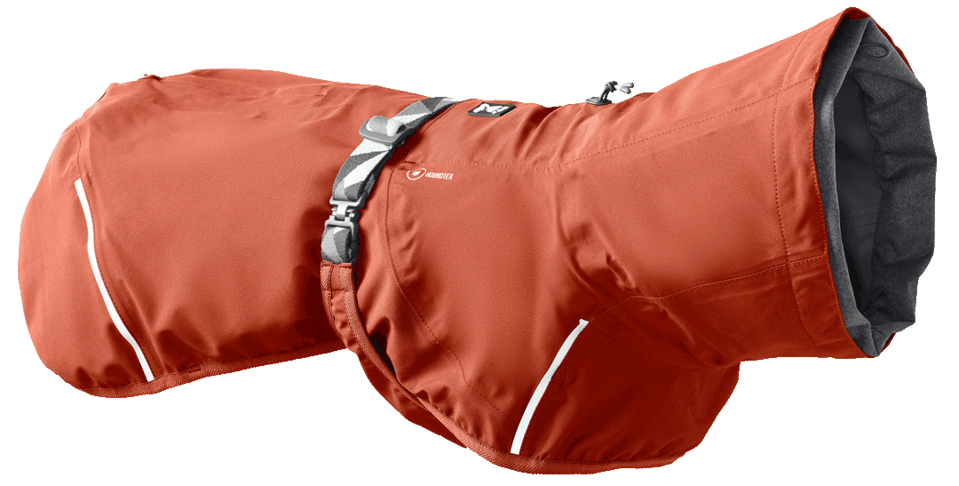 This thin dog raincoat does not have a fabric lining but it is laminated with a soft, smooth waterproof membrane. Rain permeability has been thought through to the smallest detail. The dog leash attachment opening can be snapped closed so that water does not run down the dog's back. And the waterproof rainstopper collar can be tightened behind the ears so that water does not run down the dog's neck. Plus, the dog raincoat is waterproof with fully taped seams.