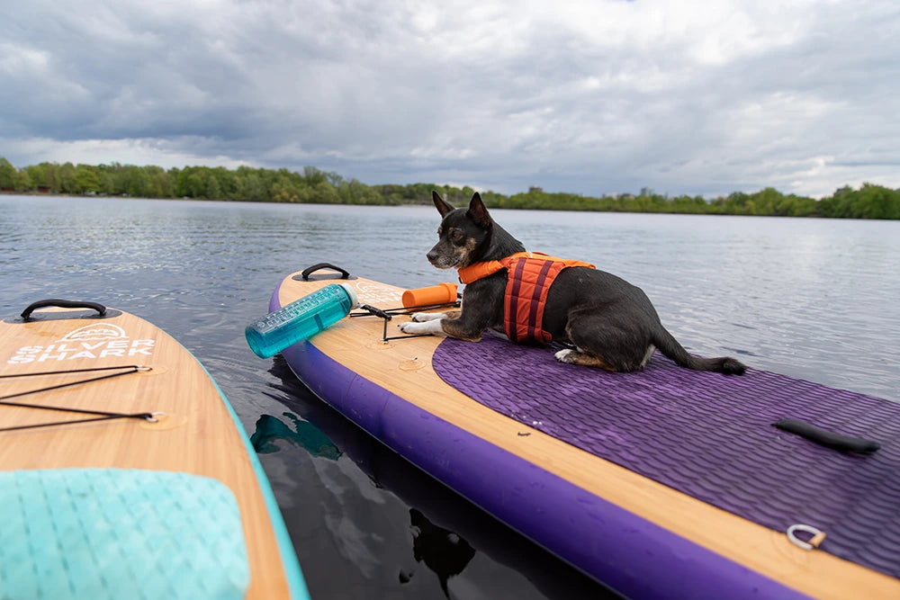 The dogs are huge fans of paddle boarding. Laszlo loves to relax on the board and take in the sun, while Cinder loves to jump off (and then subsequently regret her decision 😅).