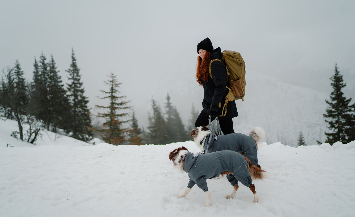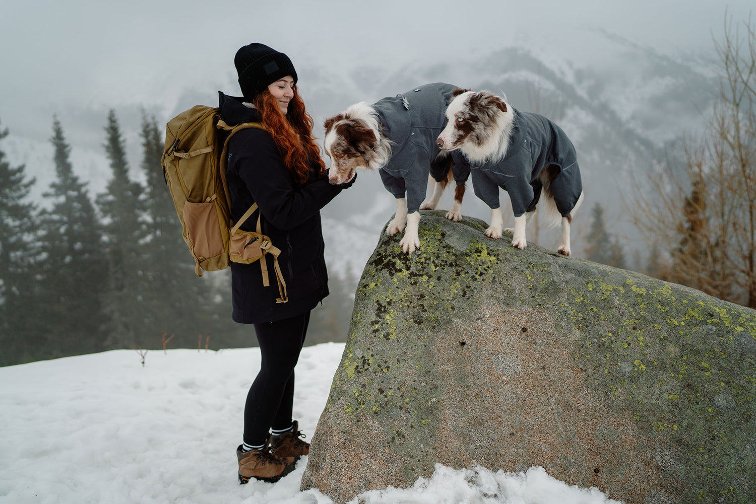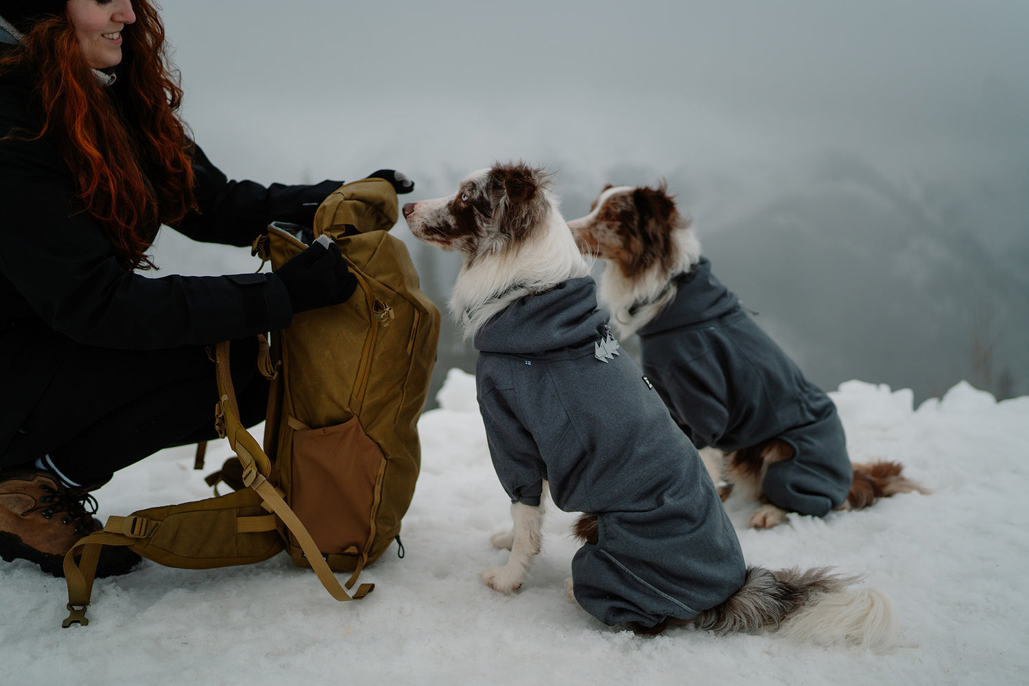 But our trip wasn't just about hiking and enjoying the scenery - we were also determined to have some fun along the way. That's why we packed a sled, much to the delight of Chilli and Zazu. This energetic duo absolutely adored the thrill of pulling the sled, their tails wagging furiously as they enthusiastically awaited the signal to dash off into the snowy wilderness. We found a long, gently sloping trail that was perfect for our sledding adventure. And thanks to the adjustable features of their Midlayer overalls, they were able to move freely and comfortably, making the experience even more enjoyable for them.