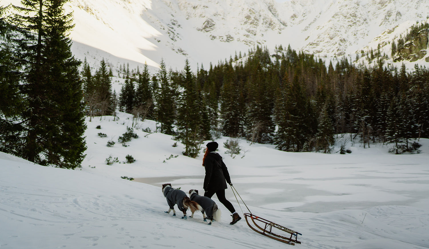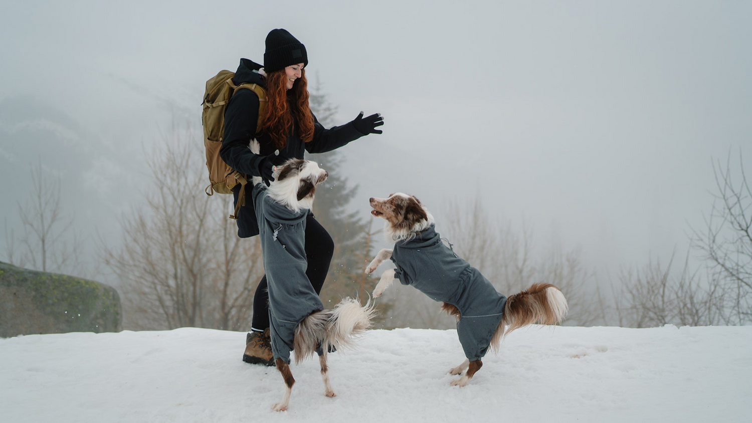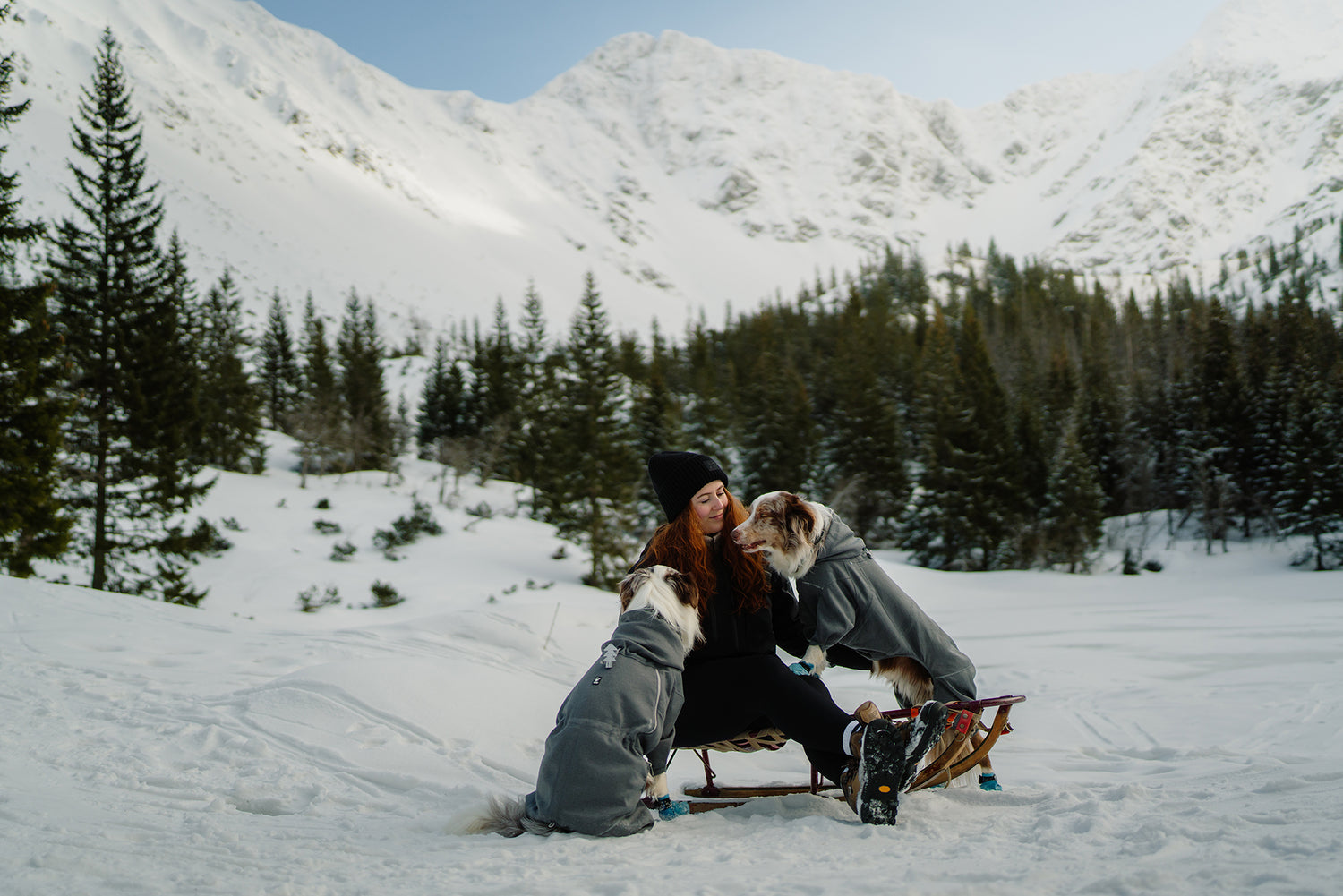 But our trip wasn't just about hiking and enjoying the scenery - we were also determined to have some fun along the way. That's why we packed a sled, much to the delight of Chilli and Zazu. This energetic duo absolutely adored the thrill of pulling the sled, their tails wagging furiously as they enthusiastically awaited the signal to dash off into the snowy wilderness. We found a long, gently sloping trail that was perfect for our sledding adventure. And thanks to the adjustable features of their Midlayer overalls, they were able to move freely and comfortably, making the experience even more enjoyable for them.