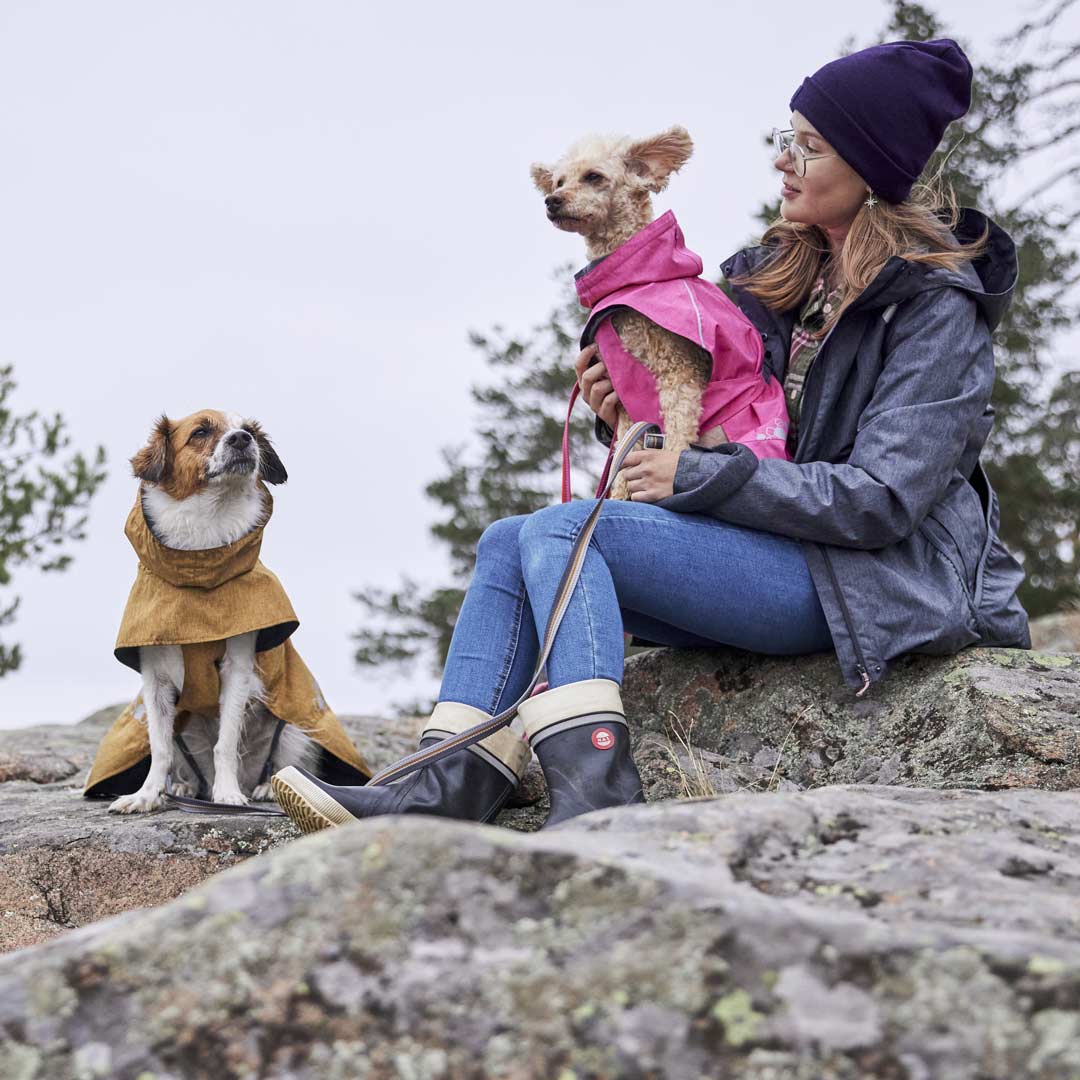 • Weather-appropriate clothing is worth it. A raincoat keeps mud and dirt at bay, saving you time cleaning both your dog and your home. It also protects your dog’s coat, leaving only the paws muddy after walks.