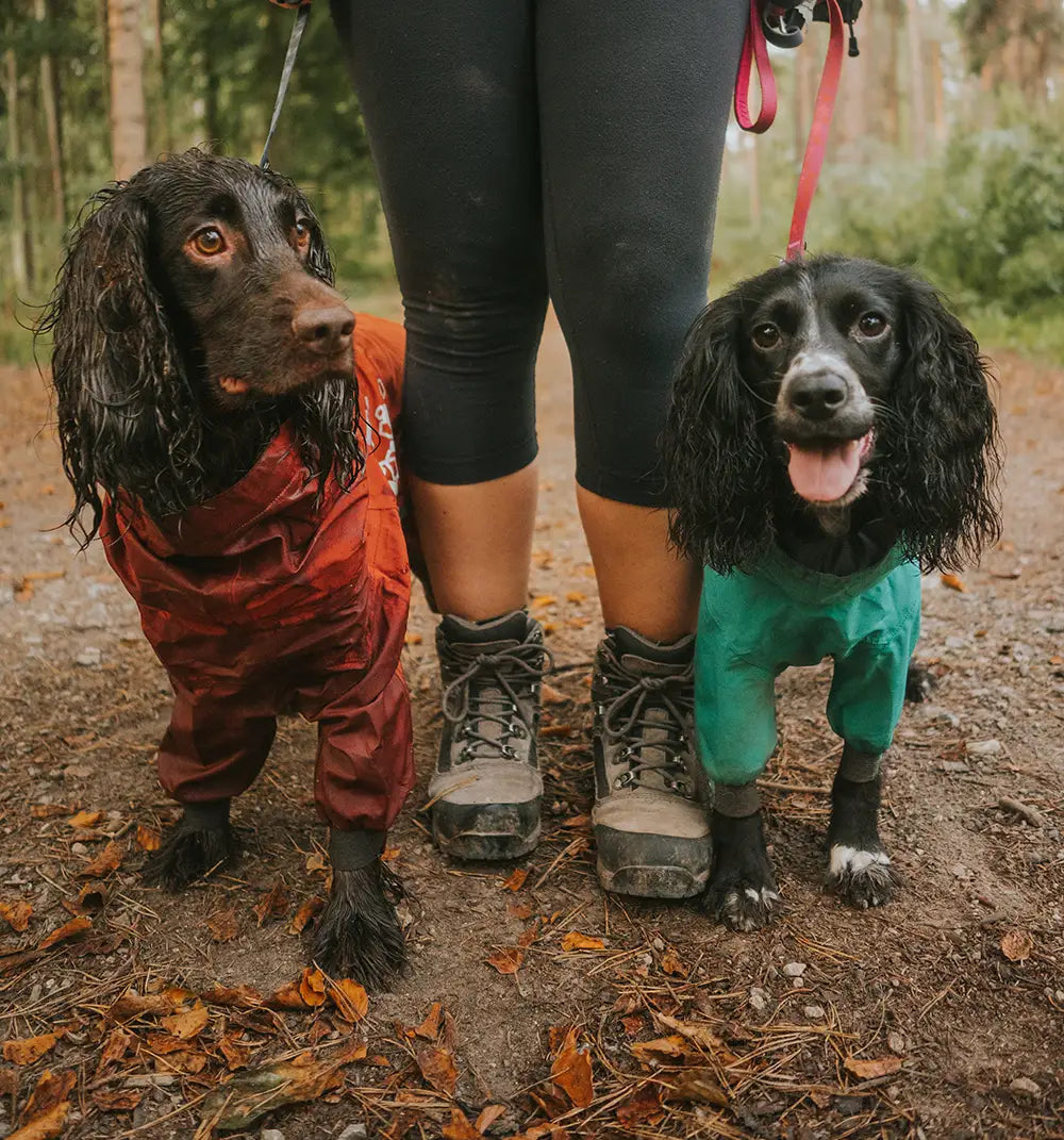 Archie wears Hurtta Mudventure Overall eco dog rain overall in color Bucthorn in size 45M and Asher wears size 35M in color Peacock.