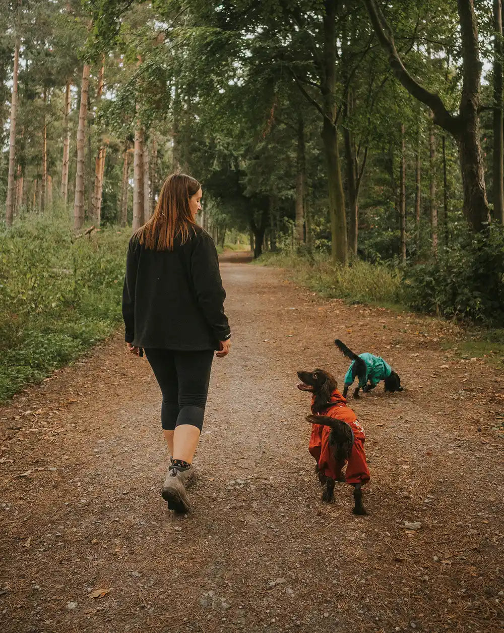 Another thing I think has been really well thought through is the adjuster inside the neck, occasionally on some of the older coats the dogs longer fur/ears got caught on the little strap, but the new design is neatly tucked away so there’s no chance of that happening. The dogs weren’t phased at all wearing the overalls, and they quite happily ran around like typical spaniels, jumping, rolling, and sniffing wherever possible.