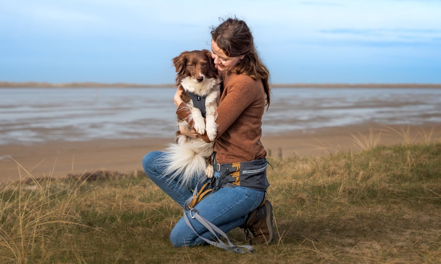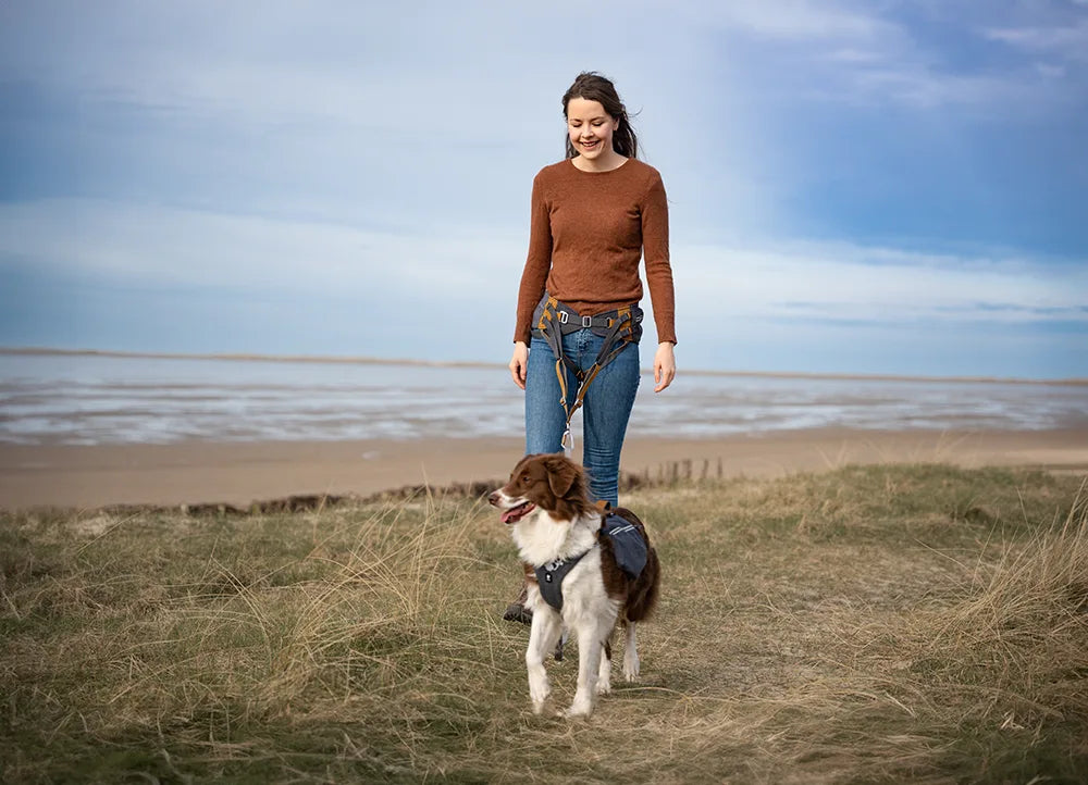The leash is Hurtta Multilong leash ECO and owner Malene is wearing Hurtta Expedition Belt ECO.