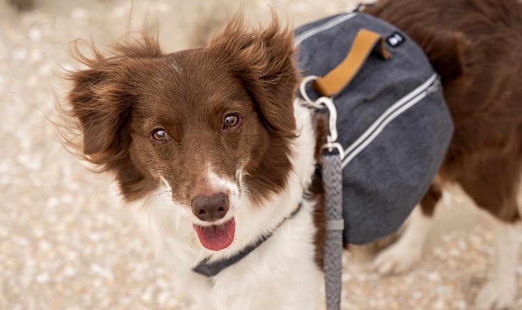 Hurtta Ambassador Keela wears size M Hurtta Expedition Pack Eco in color Blackberry.
