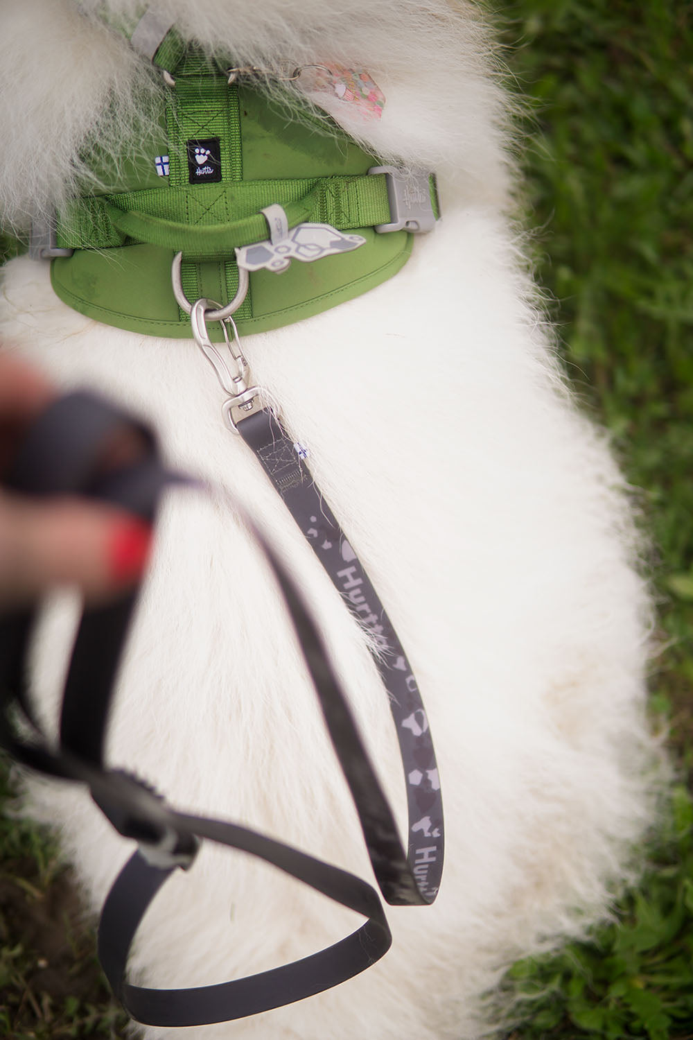 Sammy is wearing a Hurtta Weekend Warrior II Eco Dog harness in size 60-80, in the color Parsley and Mudventure Leash in color Blackberry.