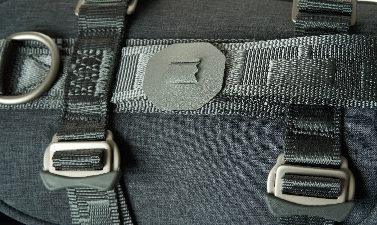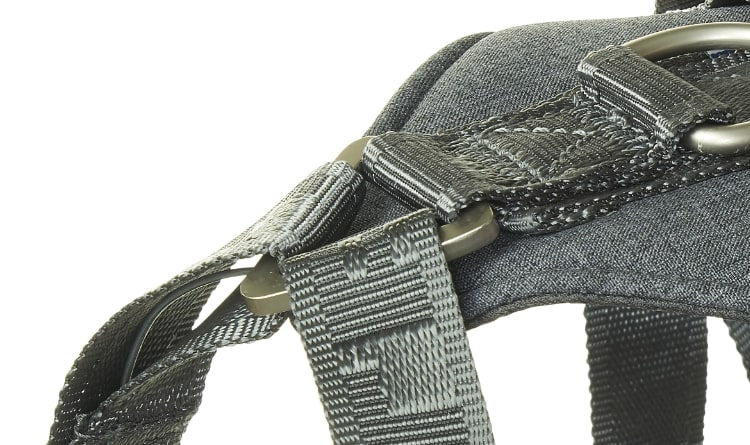 The crucial triangular loop at the base of the dog's neck, along with all other metal components of the harness, is made from single-piece stainless steel cuts for enhanced durability and safety. After finding that welded parts were not sufficiently strong, we designed the loops and fastening buckles as well as the stress-bearing metal parts to be cut from a single thick sheet of metal, ensuring superior strength and safety