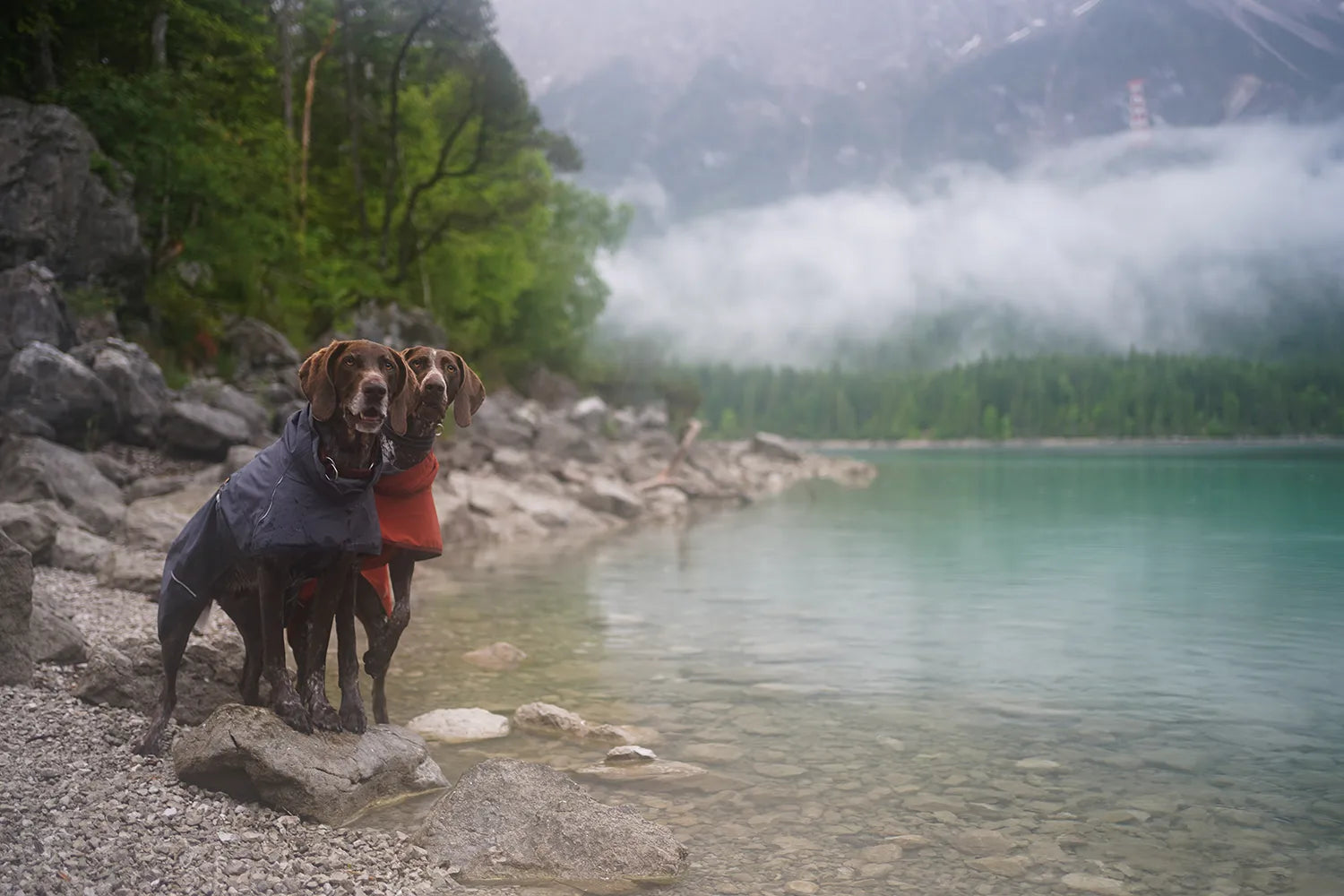 Hurtta Adventurers German Shorthaired Pointers Spot and Yuna are wearing the Hurtta Mudventure dog raincoats in size 55 in colors Cinnamon and Blackberry.