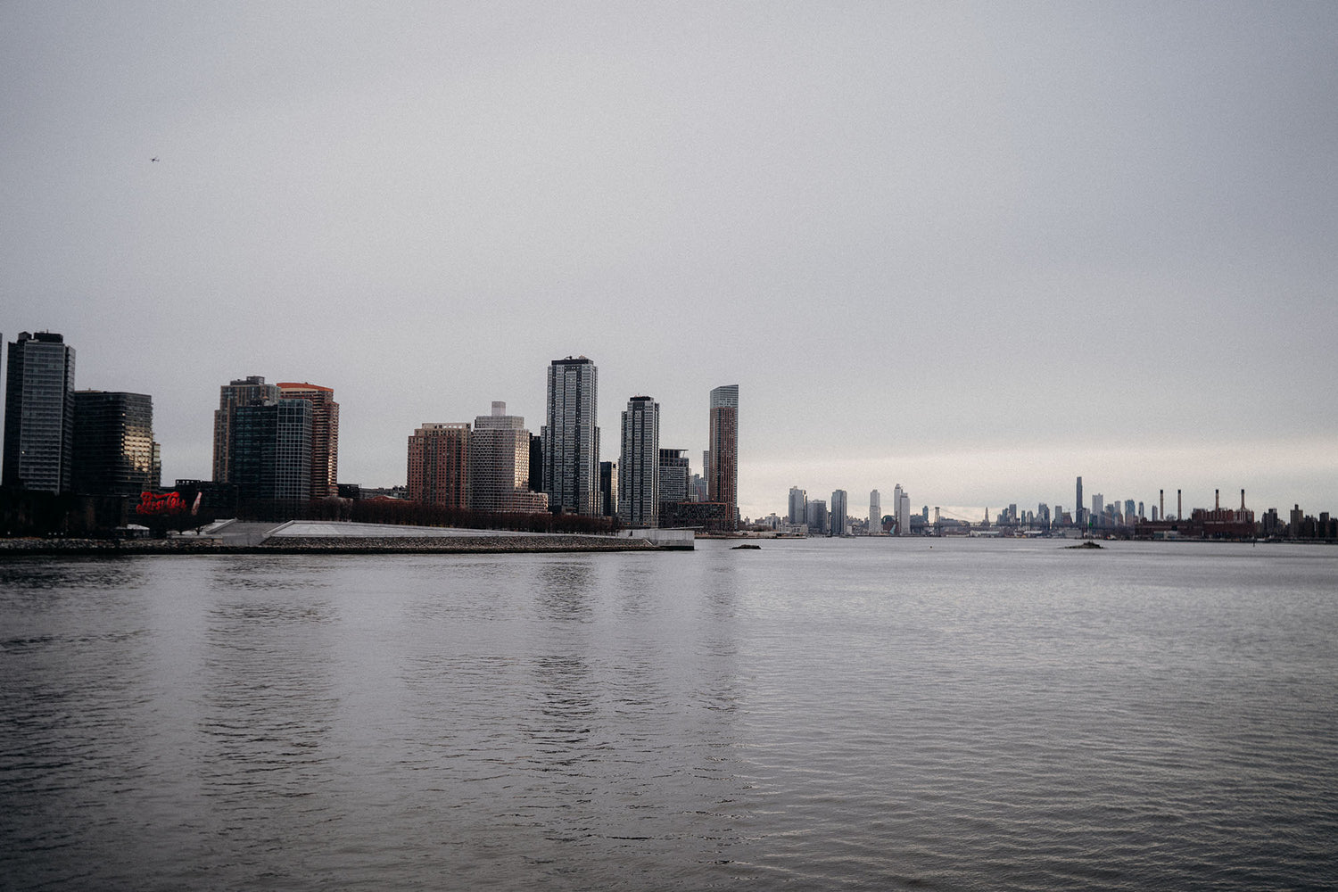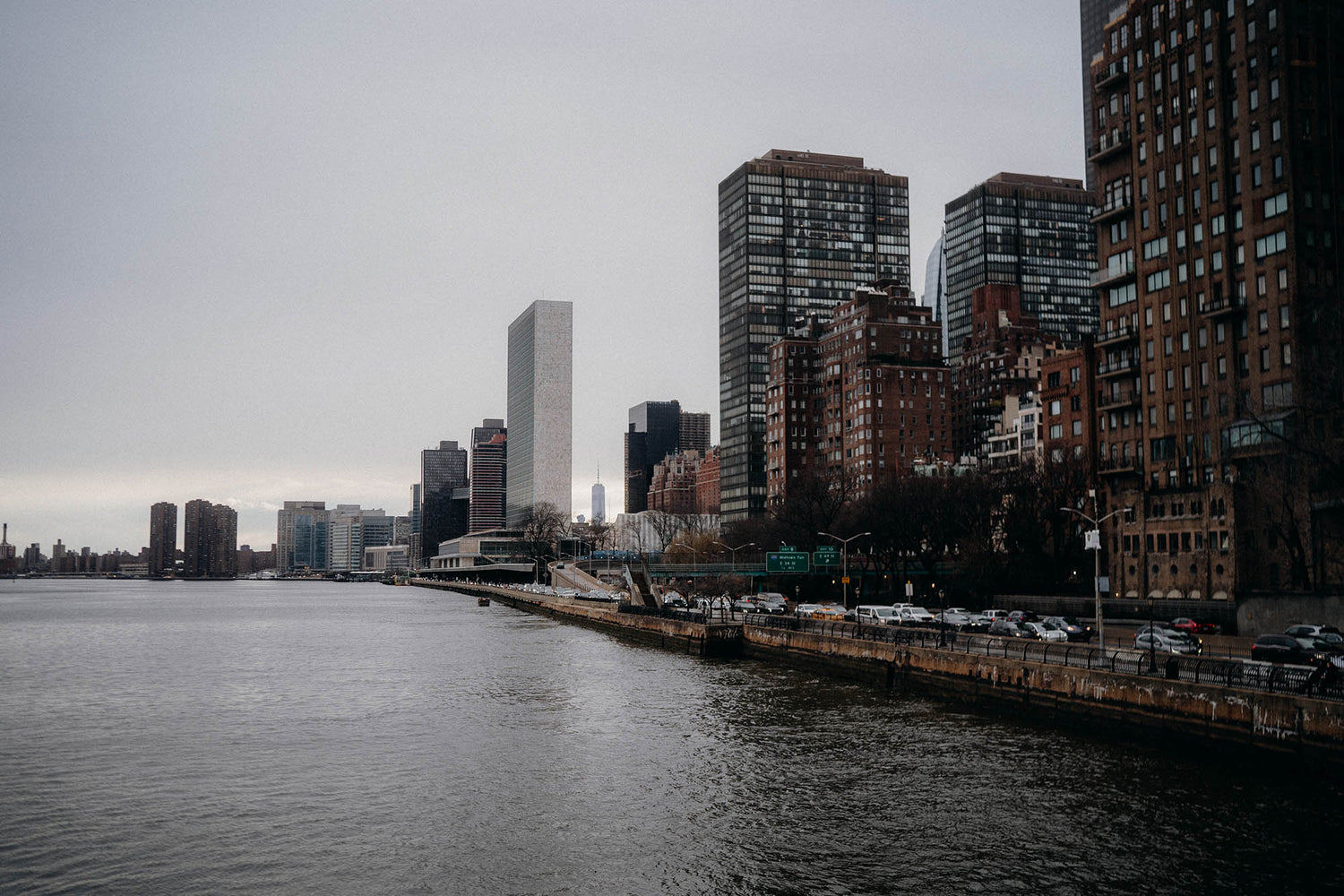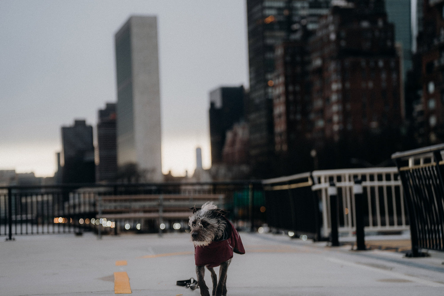 In the lively heart of Manhattan's busy east side, Cyrus and I like to spend our time at the East River Esplanade. It's a peaceful spot where we can take a break from the city hustle and bustle and enjoy watching the river flow by and the boats pass against the skyline. As the sun starts to rise, painting the city in golden light, we watch together as a new day begins. The United Nations Building stands tall in the distance, watching over the city as it wakes up.
