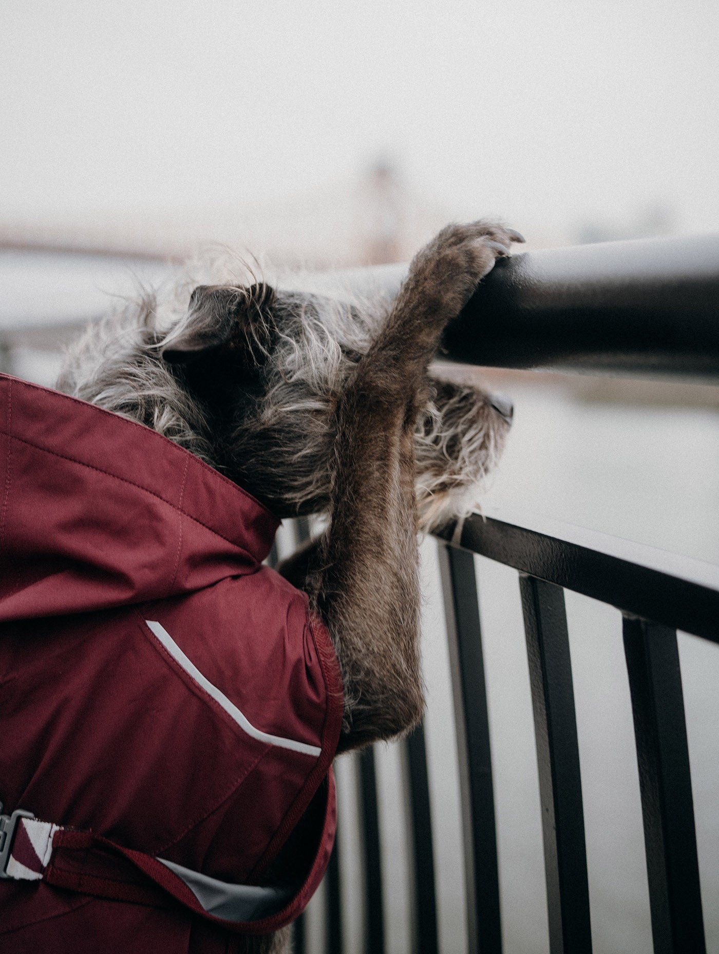 But even in this calm place, the weather can be unpredictable. Sometimes the river breeze gets chilly, and there might be a bit of rain. That's where the Mudventure Dog Coat ECO by Hurtta comes in handy. It keeps him warm and dry, so we can still enjoy our time outside. The coat is not only practical but stylish too. It's stylish eggplant color blends in well with the city scenery. Plus, it's designed to work perfectly with Cyrus's Casual Y Eco dog Harness by Hurtta, so he can move around easily as we explore the city streets.