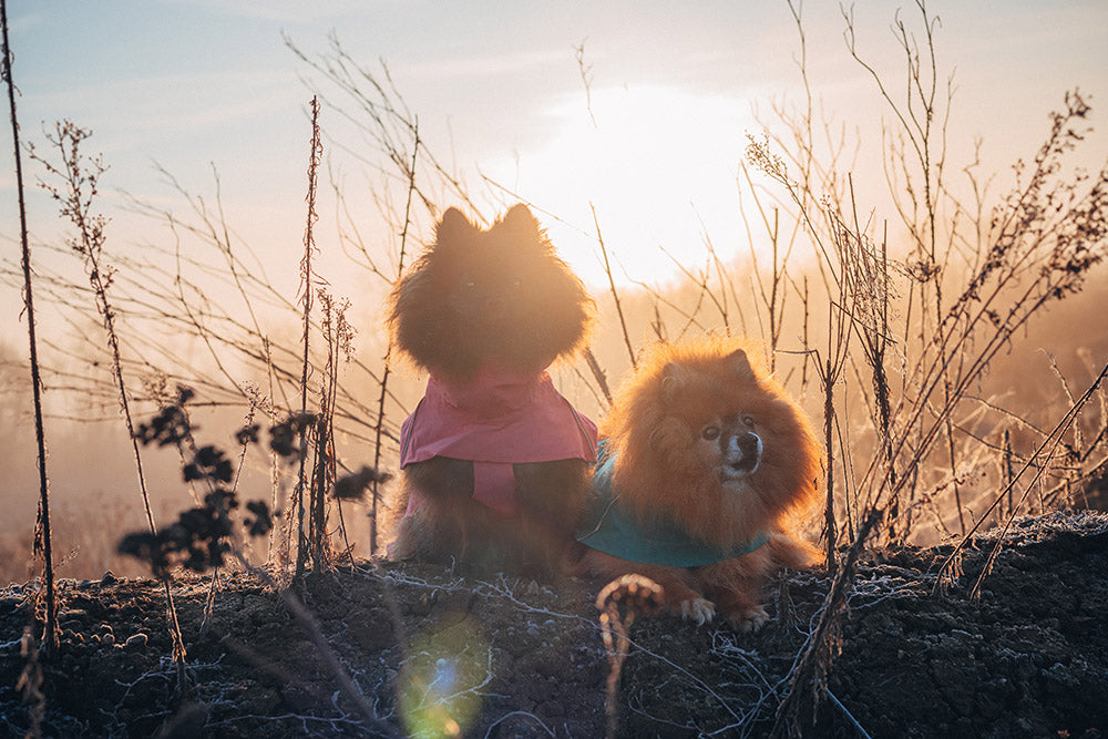 Hurtta Adventurers Reynard 4 kg, Cora 3 kg are wearing the Hurtta Monsoon coats ECO II in size 30.