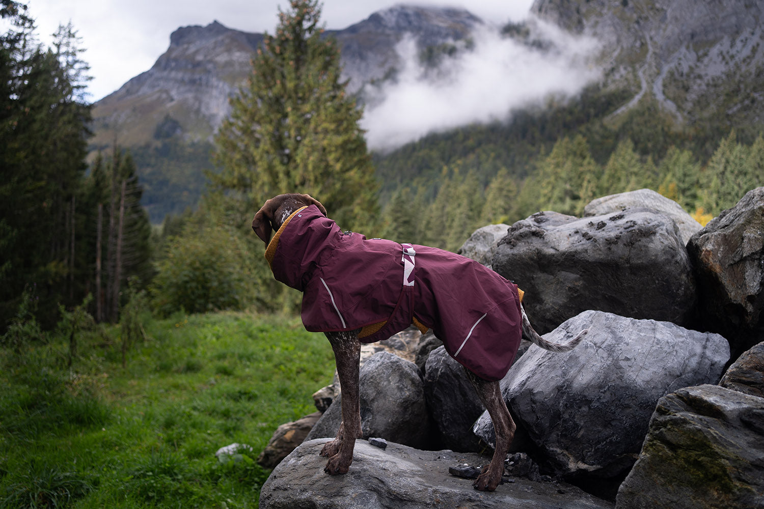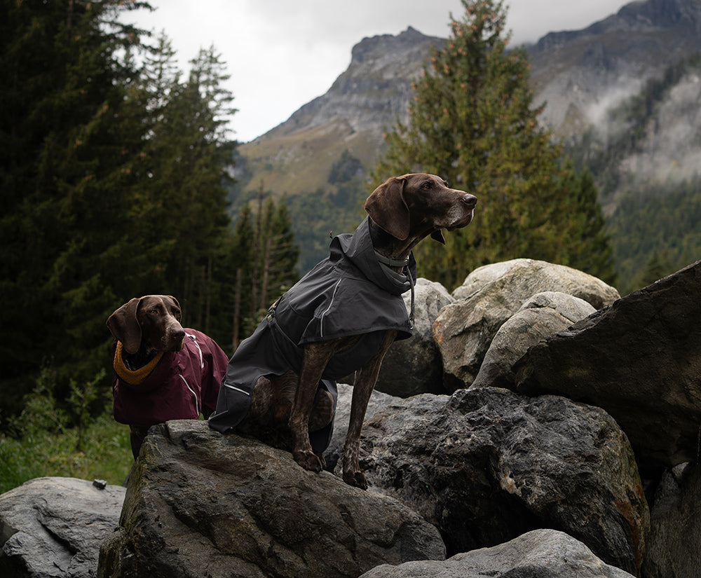 Hurtta Adventurers German Shorthaired Pointers Spot and ZaYuna are wearing the Hurtta Mudventure Coat dog raincoats and Hurtta Warming Midlayer Dog Jackets in size 55.
