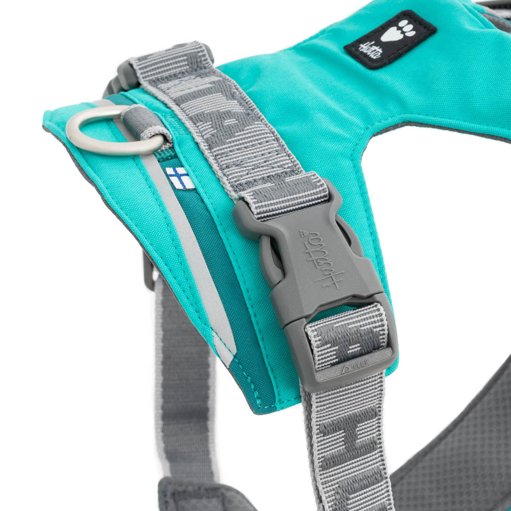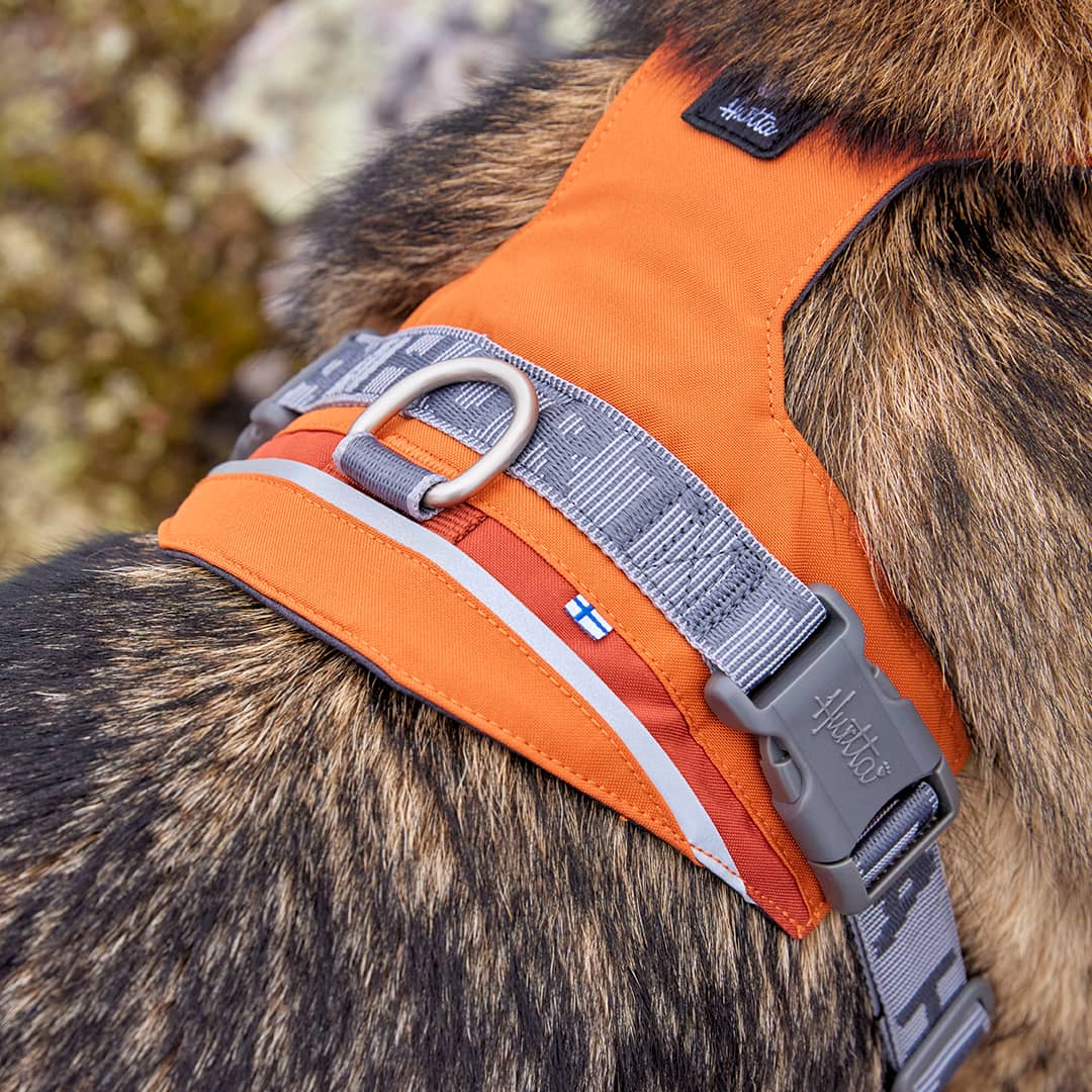 Valjaassa on vahva pintakangas ja pehmeän mukava vuori. Heijastinnauhat selässä ja rinnassa lisäävät näkyvyyttä pimeällä. Upeat Hurtta-nauhat tekevät valjaan ilmeestä reippaan iloisen.