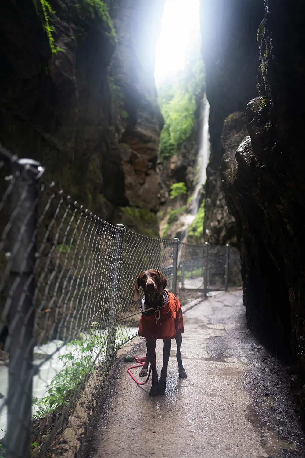 Both dogs wore their Hurtta Mudventure Dog Raincoats ECO—a must on this kind of trail. Between the mist, waterfalls overhead, and unpredictable mountain rain, raincoats kept them both dry, warm, and ready for anything. This lightweight and breathable dog rain jacket moved easily with the dogs, never restricting their pace or curiosity.