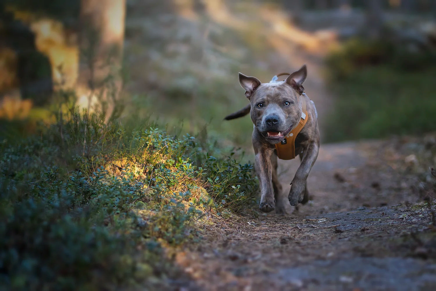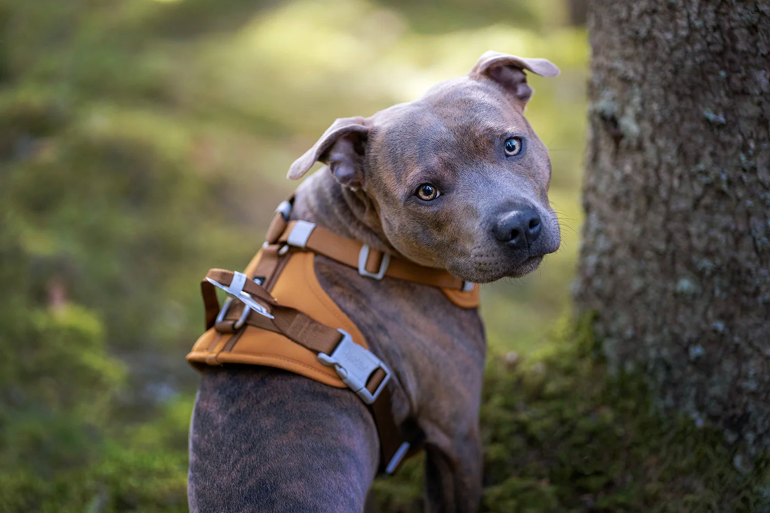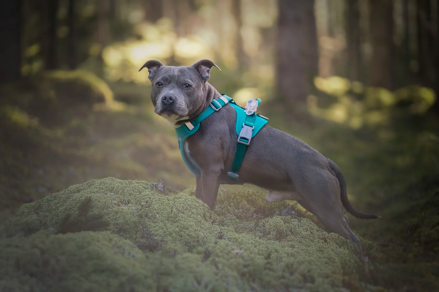 Hurtta Adventurers Junior 15kg & Alfie 13.5kg are Staffordshirebullterriers and they both wear Hurtta Weekend Warrior dog Harness II Eco. Junior wears color Peacock and Alfie color Desert and both have size 55-70.
