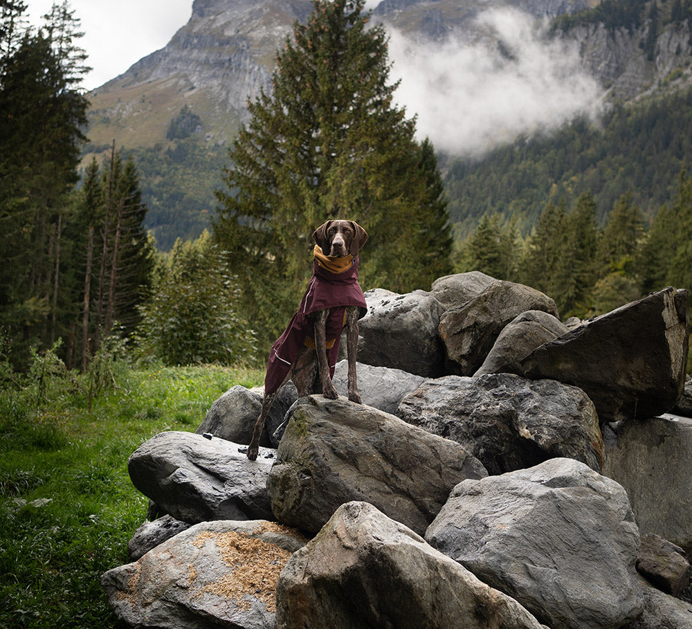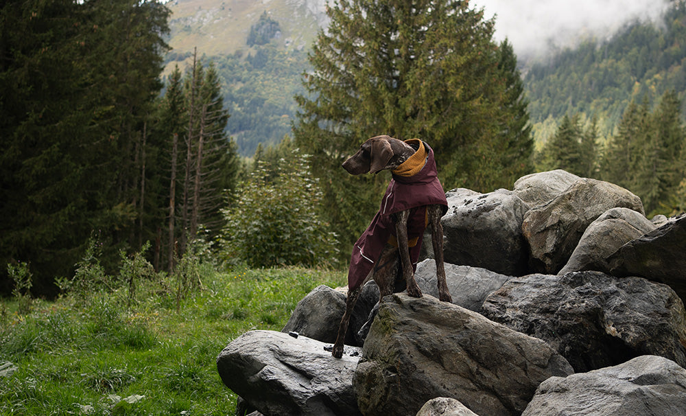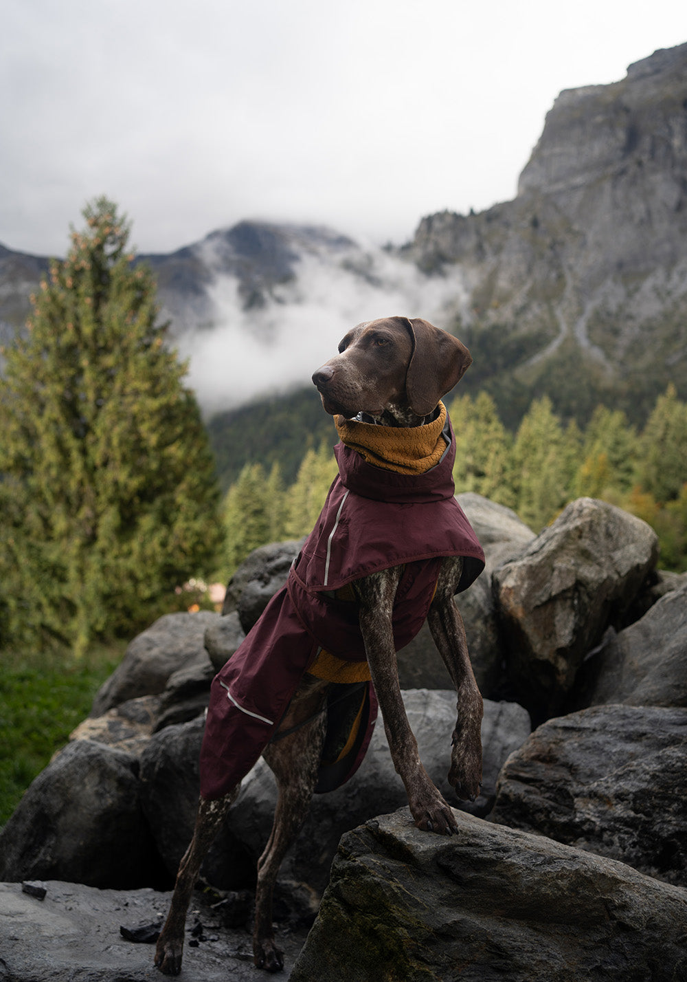 Hurtta Adventurers German Shorthaired Pointers Spot and ZaYuna are wearing the Hurtta Mudventure Coat dog raincoats and Hurtta Warming Midlayer Dog Jackets in size 55.
